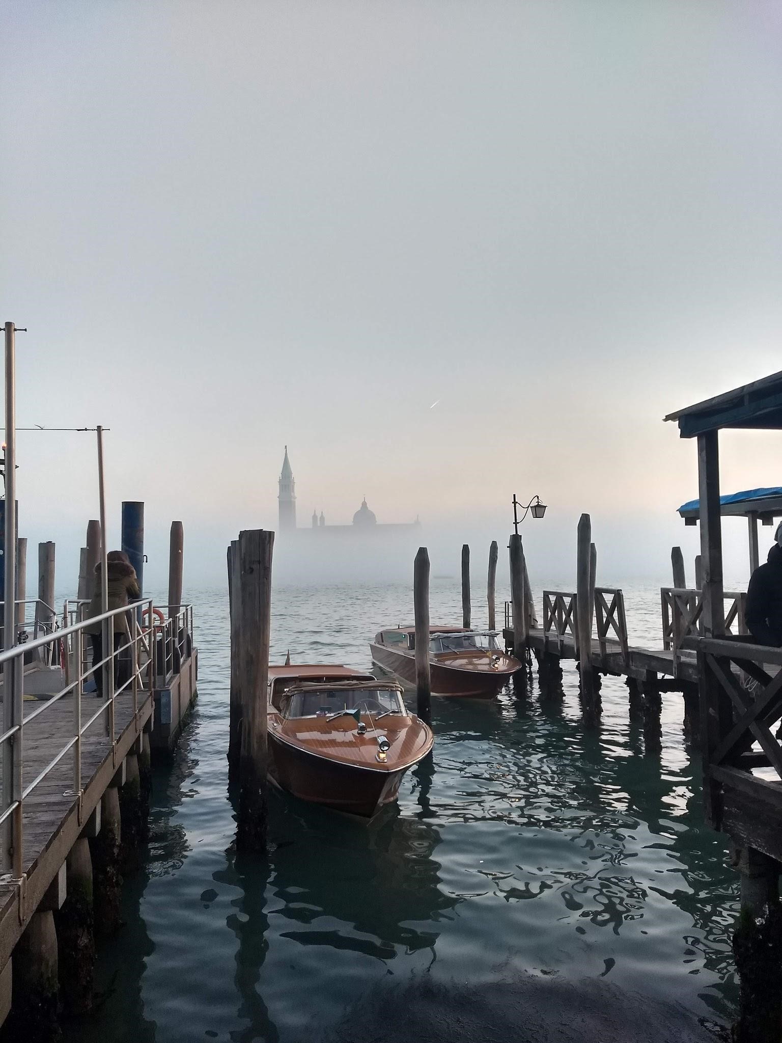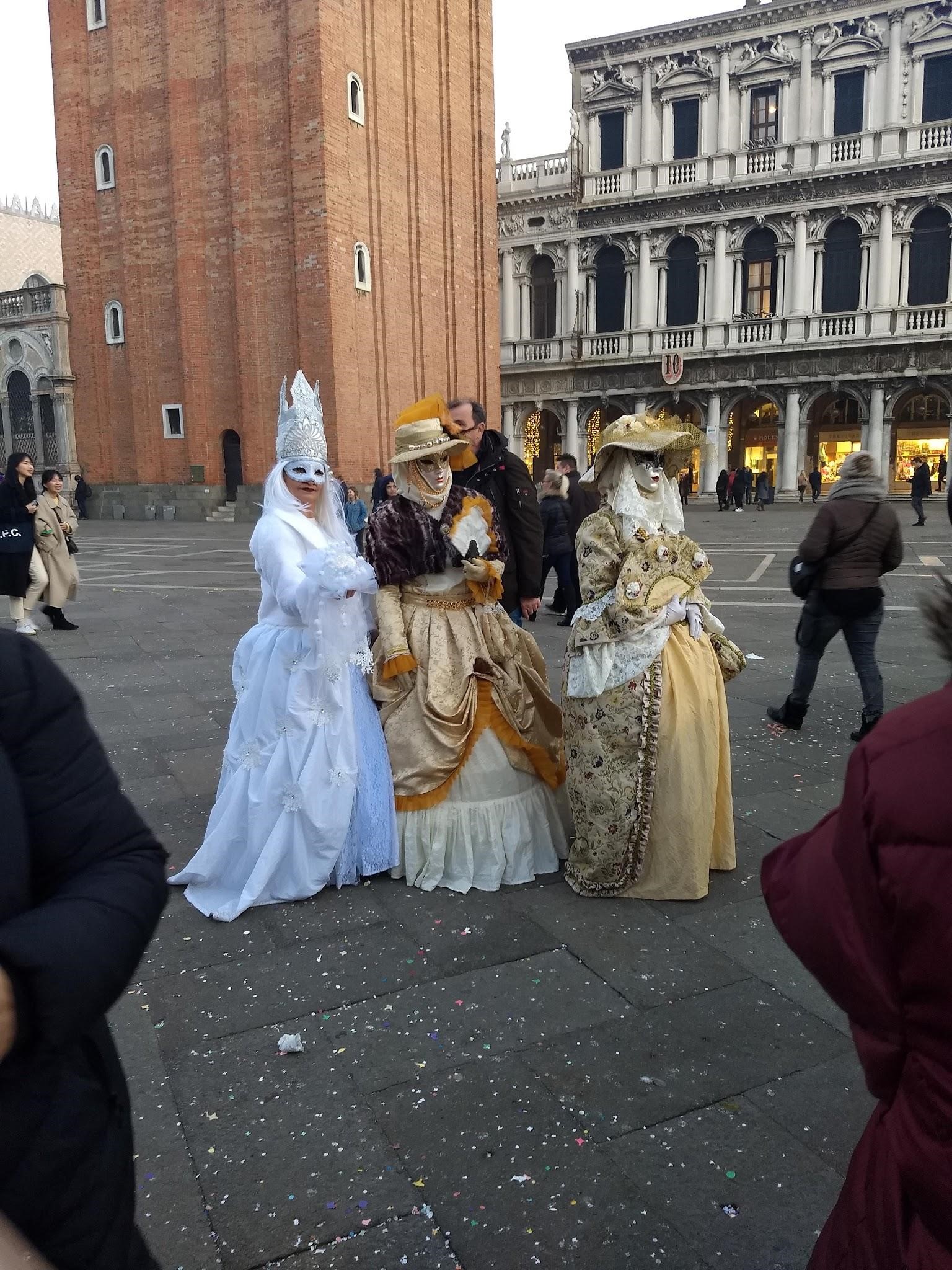 Below are just a few of the many pictures I took while in the famous city during my time there. The left is the traditional Venetian city state flag flying in front of a church. The middle is a foggy picture of the Church of San Giorgio Maggiore in the distance. And the right picture is of three Venetian women in traditional Carnevale costumes and masks.