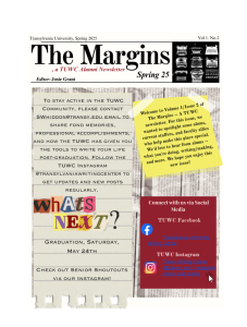 The Margins is a TUWC staffer-written newsletter for TU alums who worked as writing center staffers. Each issue covers writing-focused campus activities, TUWC staffer updates, and news about TUWC events. Founded by Josie Grant (’25) and currently with Dylan Howell (’26) at the helm, this project is a collaboration with TU Alumni Engagement.